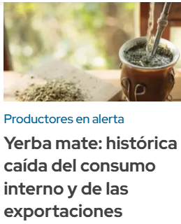 El consumo interno de yerba mate acumulado entre enero y octubre de este año alcanzó los 215.331.111 kilos, marcando el nivel más bajo desde 2016, cuando en el mismo período se registraron cifras similares, según datos del Instituto Nacional de la Yerba Mate (INYM).En el mismo año que se encamina a cerrar con una cosecha histórica de 1000 millones de kilos, el consumo interno se mantiene como uno de los más bajos de la década y el acumulado con los envíos al exterior es el más bajo de los últimos cinco años. En paralelo, el sector primario padece el desplome de los precios de la hoja verde.